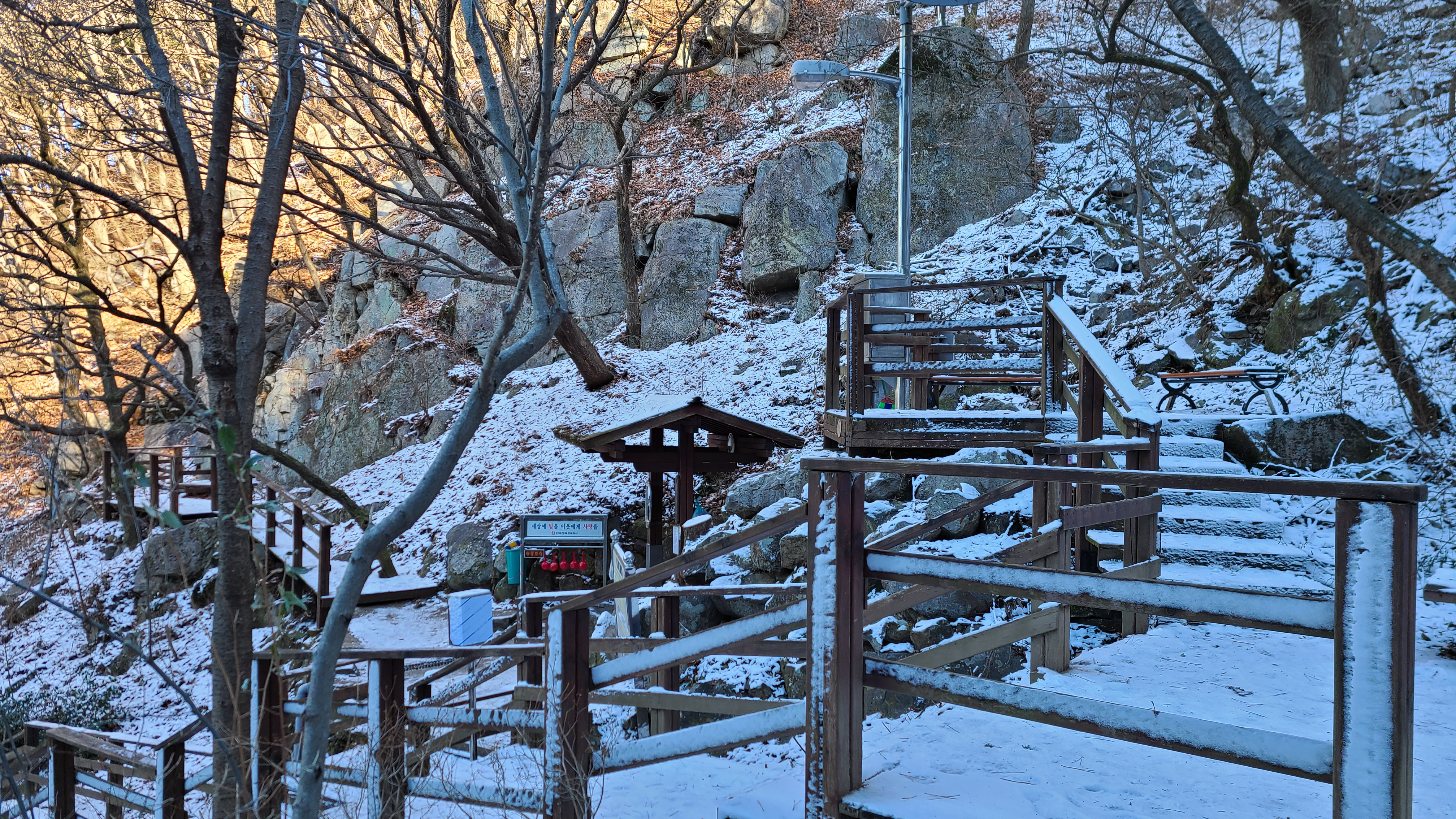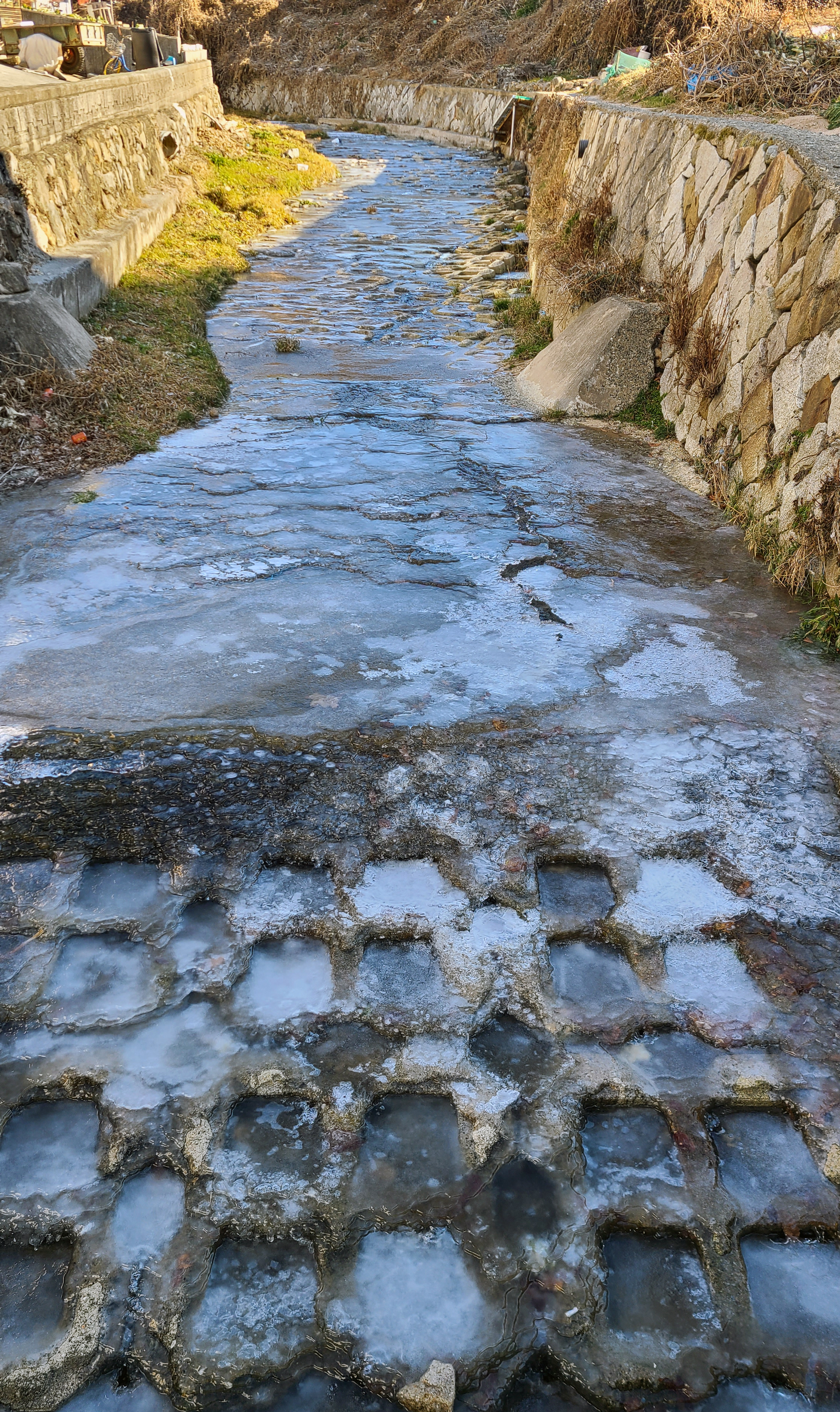 좀처럼 물이 얼지 않은 따뜻한 남쪽 지방인데 오전 10시가 넘었는데도 얼어 있는 계곡물이다.