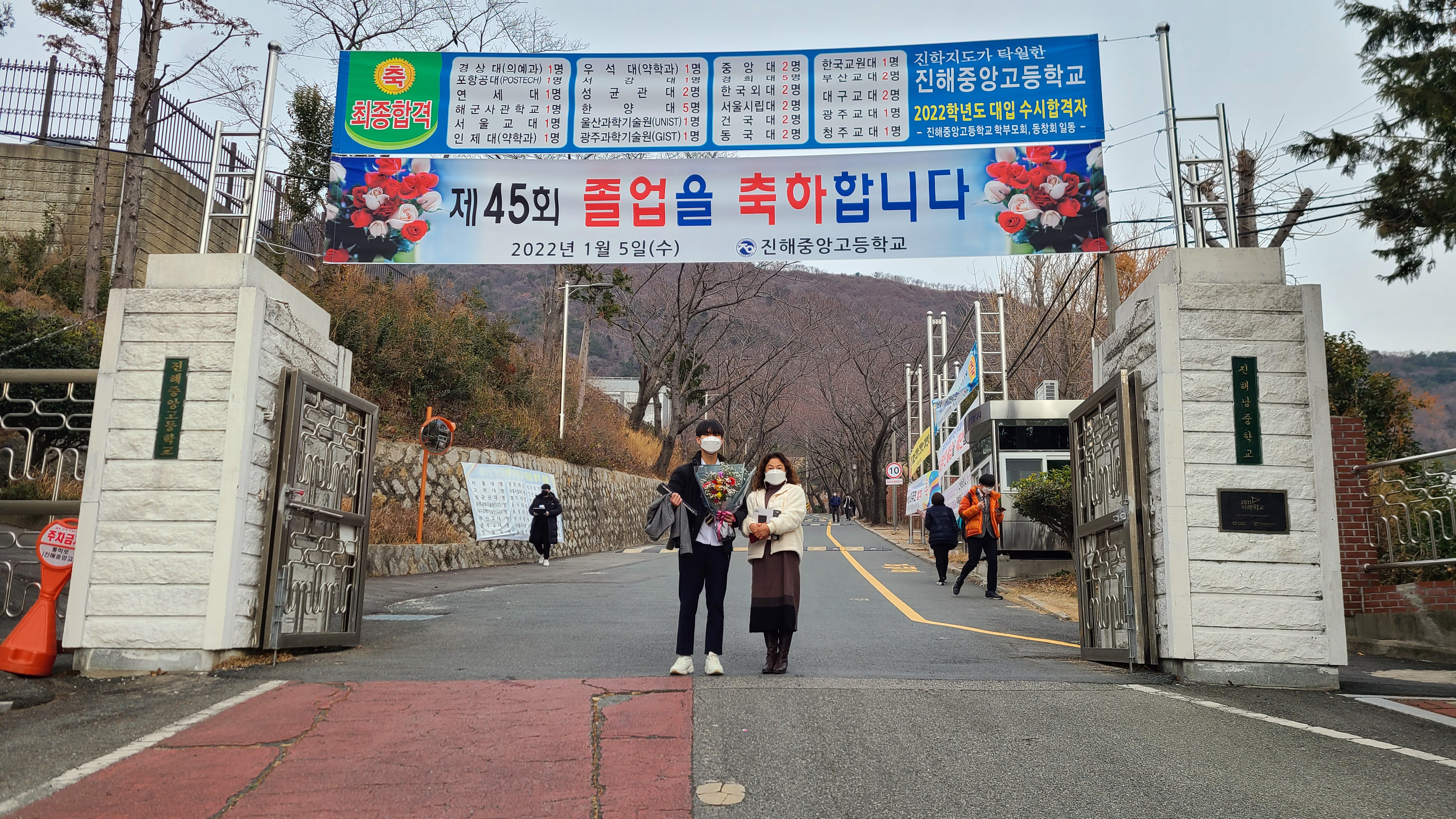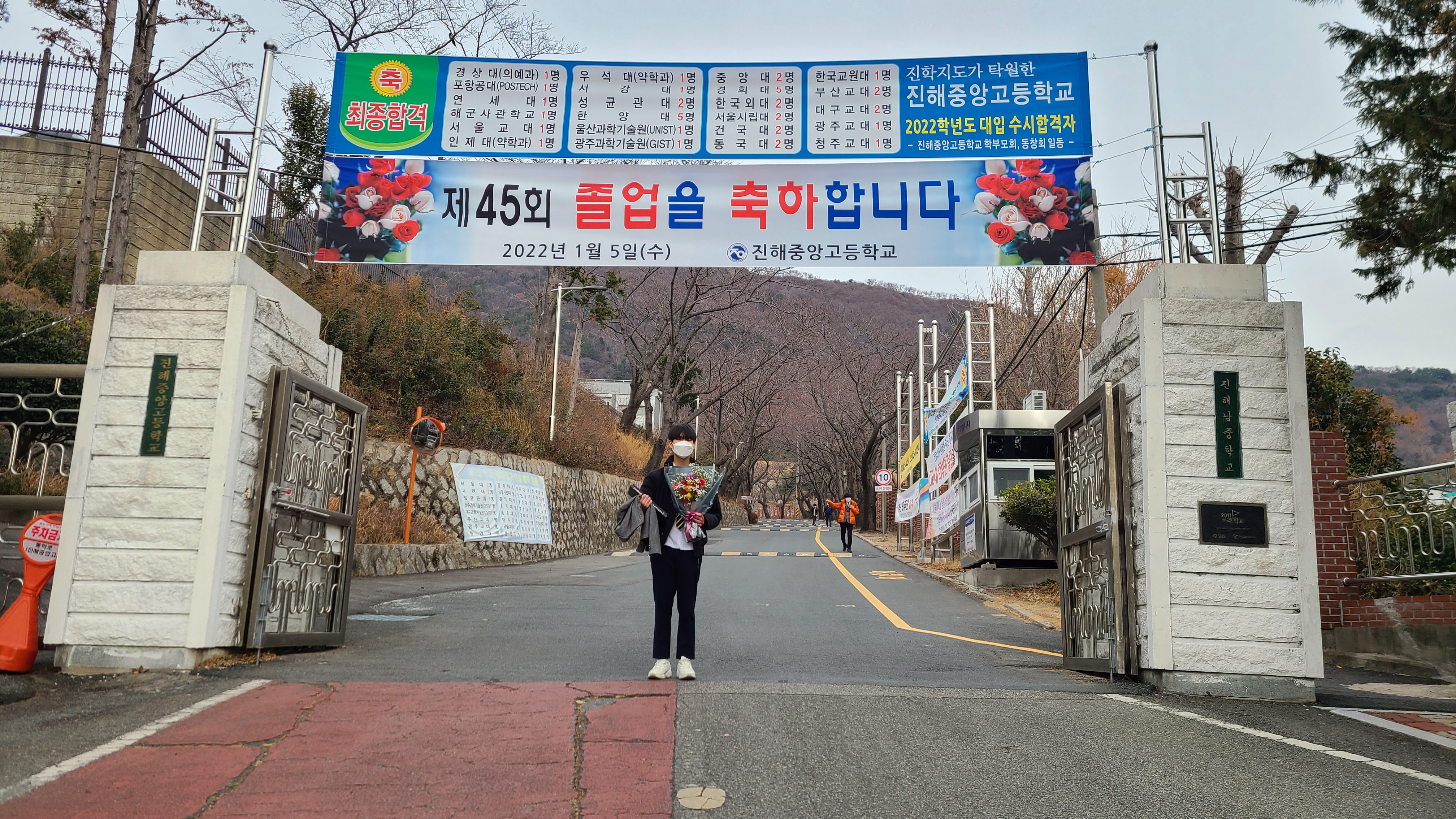 교문과 교문 위로 걸려 있는 현수막_수시 합격자와 대학 이름을 적어 놓은 현수막을 배경으로 촬영했다.