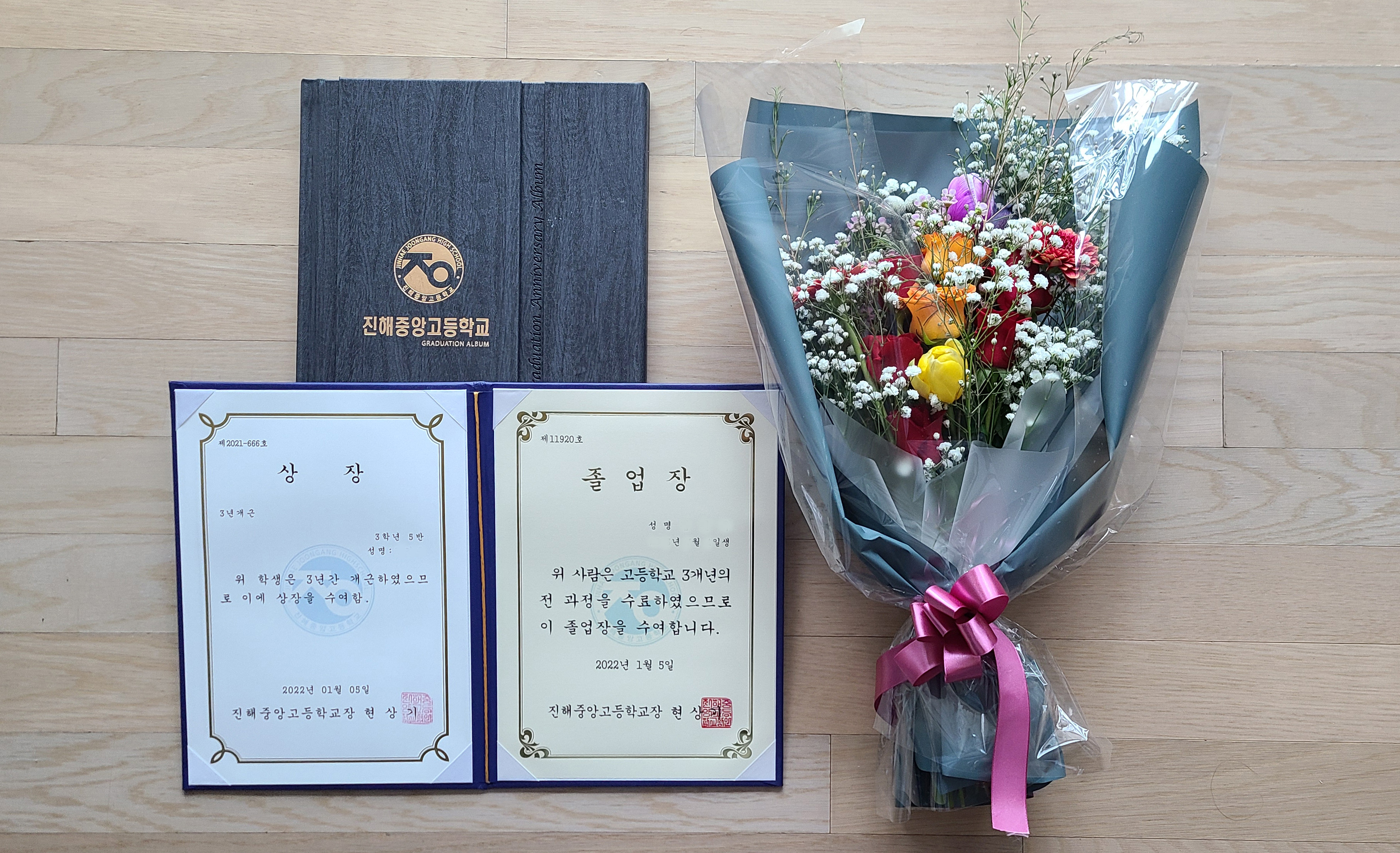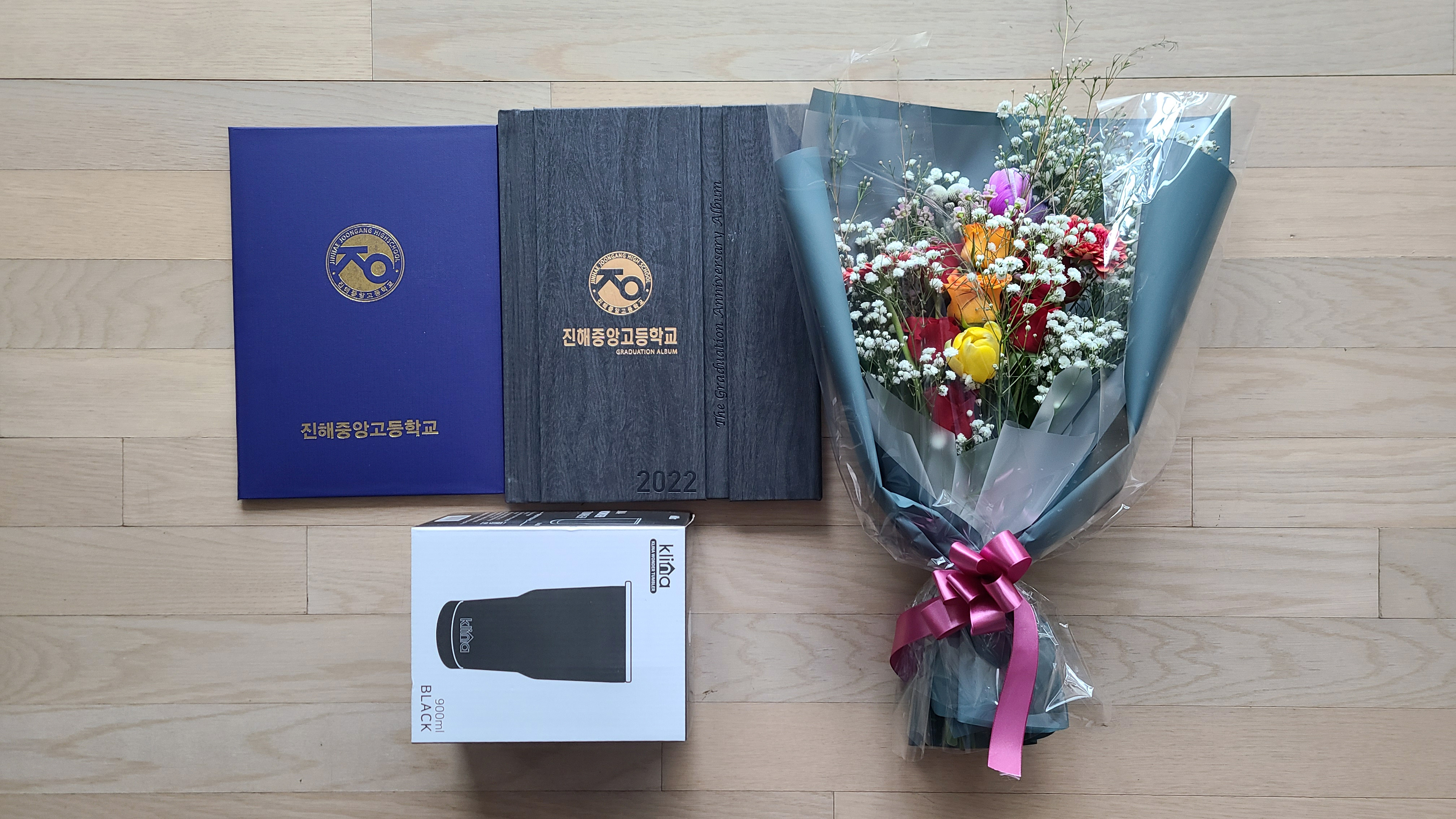 졸업장과 개근상과 앨범과 꽃다발과 텀블러.